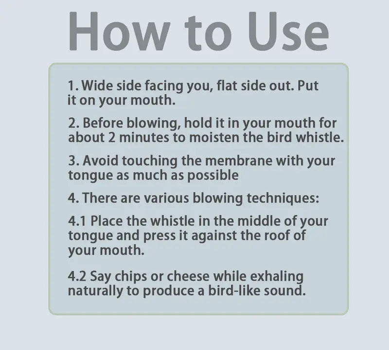 Experiment with different techniques to create bird-like sounds, such as pressing the whistle against the roof of your mouth or saying “chips” or “cheese” while exhaling.