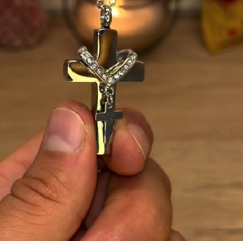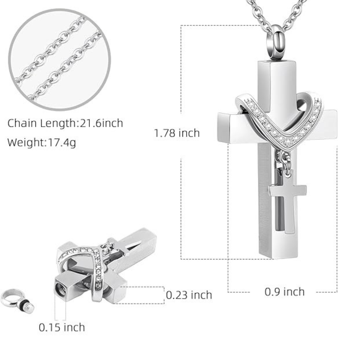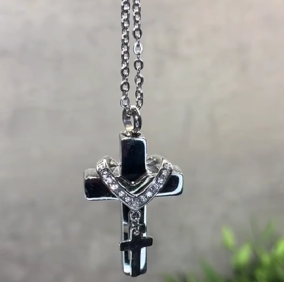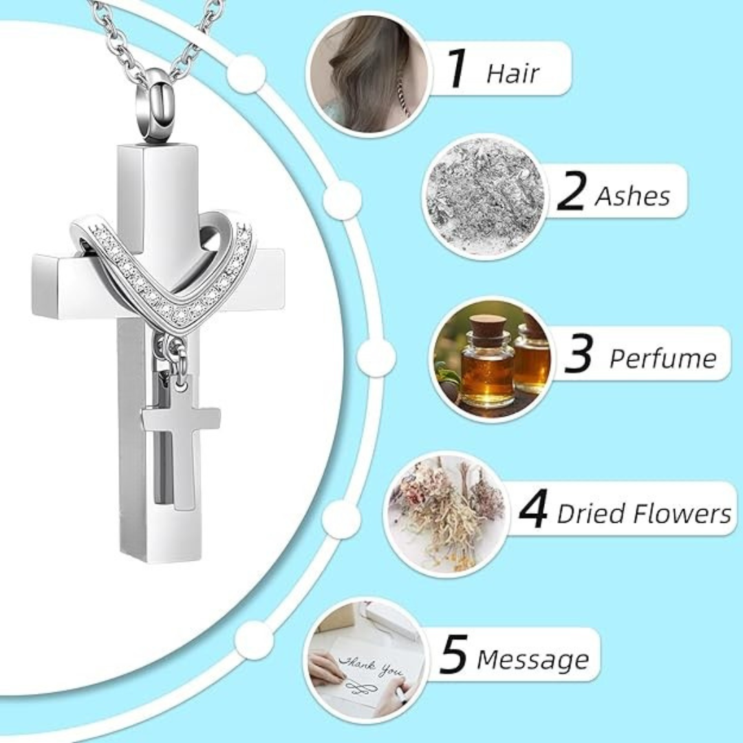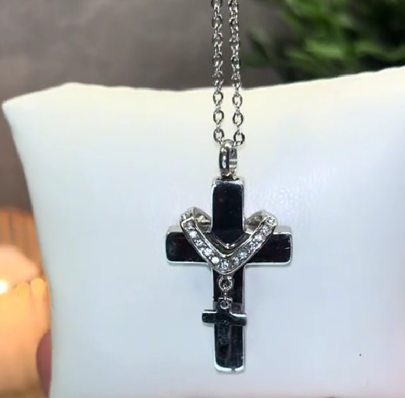 This cross pendant holds hair, ashes, perfume, dried flowers, or a message, keeping your loved ones close.