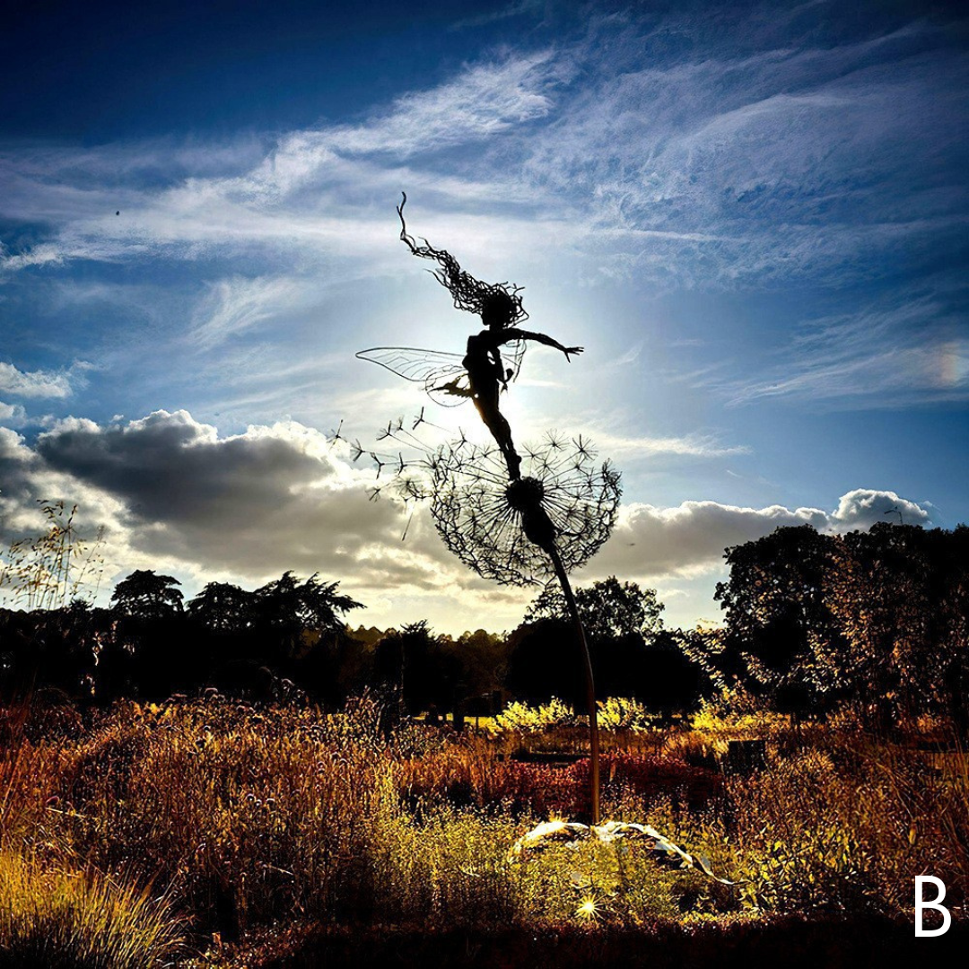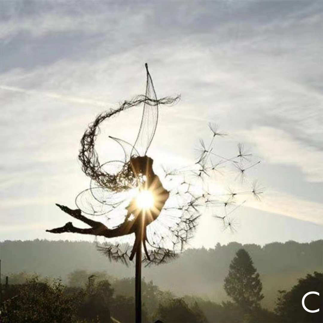 Bring a touch of magic to your garden with this enchanting metal sculpture featuring delicate fairies dancing upon a blooming dandelion. Handcrafted with intricate detail, this artwork captures the whimsical charm of fantasy and the beauty of nature in perfect harmony.